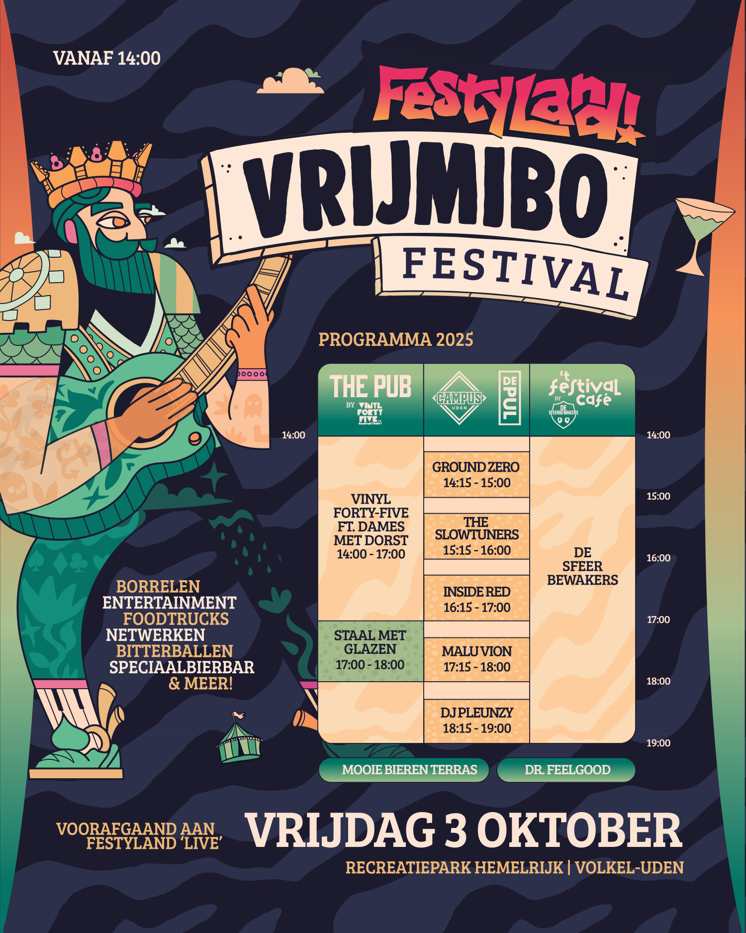 Het FestyLand-weekend kan ons niet vroeg genoeg beginnen! Daarom trappen we vrijdag 3 oktober af met het grootste VrijMiBo Festival van de regio. Verwacht verrassende acts, koude drankjes en natuurlijk bitterballen. Die traditie nemen we vanuit De Pul natuurlijk gewoon mee.